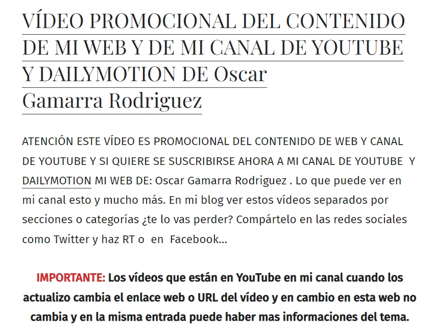 IMPORTANTE: Los vídeos que están en YouTube en mi canal cuando los actualizo cambia el enlace web o URL del vídeo y en cambio en esta web no cambia y en la misma entrada puede haber mas informaciones del tema.